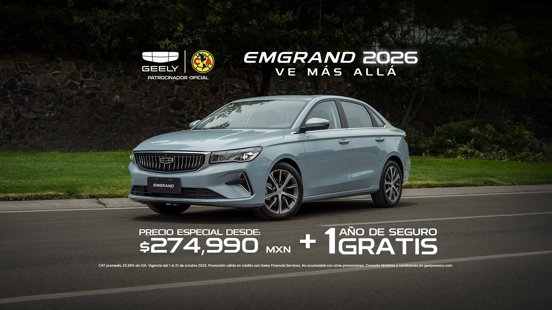 El precio de $274,990 MXN aplica al utilizar el Bono dragón con el plan de crédito simple, únicamente a través de Geely Financial Services (BBVA México S.A., Institución de Banca Múltiple), para el modelo Emgrand 2025 en su versión GC, sobre un precio de $299,990 MXN El Nuevo Bono a precio de $25,000 MXN (IVA Incluido, aplica seguro por un año gratis, y no es acumulable con otras promociones..