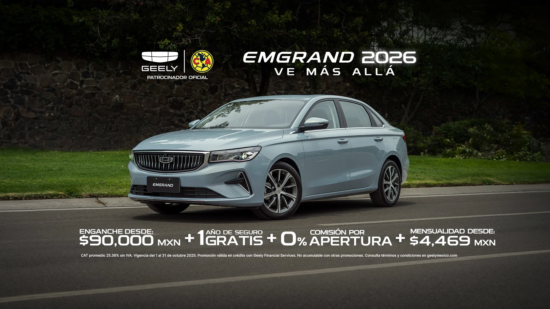 "El año de seguro gratis” aplica para el modelo Emgrand 2025 en su versión GC en operaciones de crédito a través de Geely Financial Services. Únicamente con aseguradoras participantes, consulta especificaciones con tu Distribuidor autorizado Geely. Al finalizar el periodo del seguro gratis el cliente deberá contratar un seguro conforme a lo señalado en su contrato de crédito.