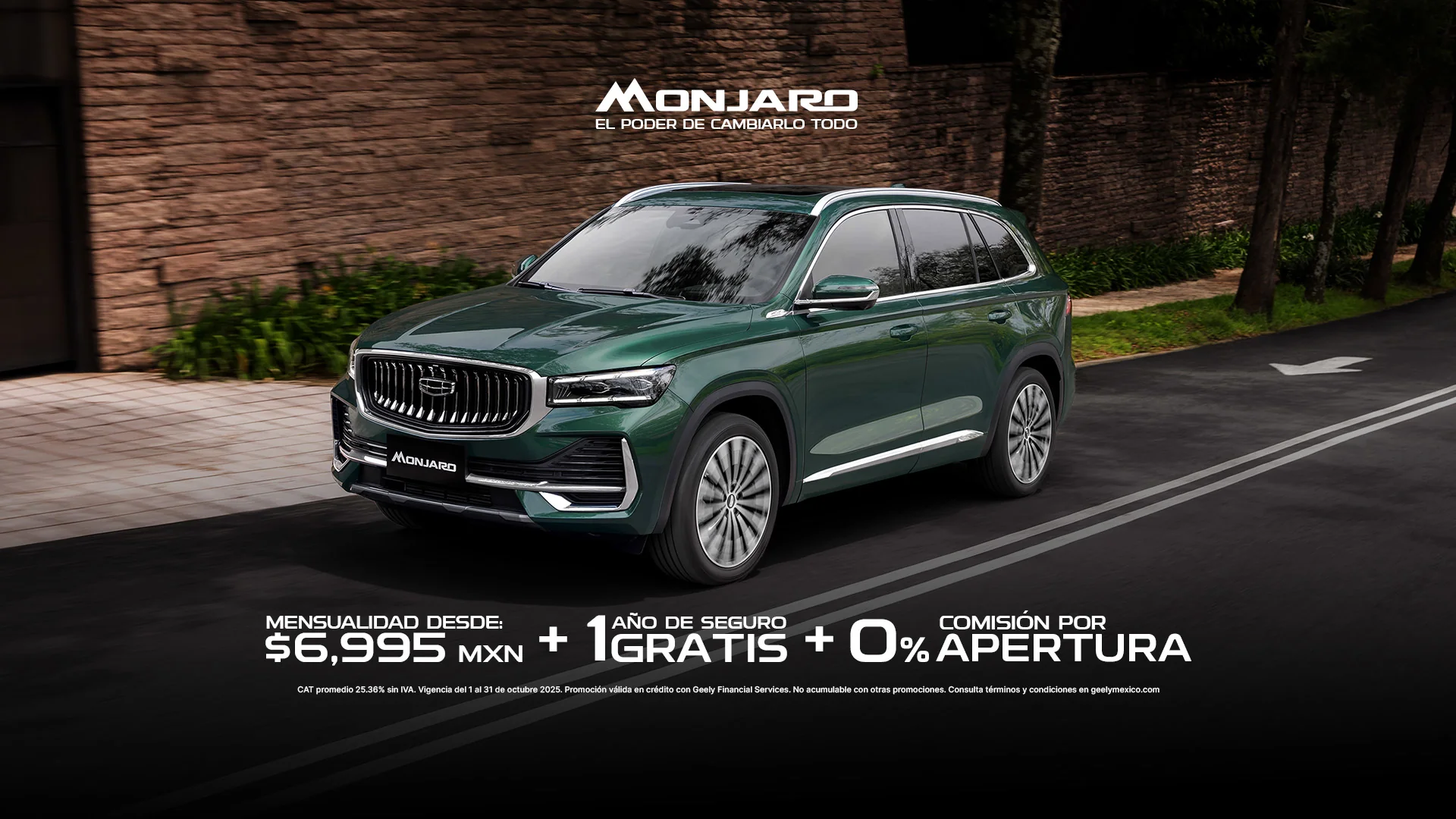 El año de seguro gratis aplica únicamente para el modelo Monjaro 2026 en su versión GF, en operaciones de crédito a través de Geely Financial Services (BBVA). Válido solo con aseguradoras participantes. Consulta especificaciones y condiciones con tu Distribuidor autorizado Geely. Al finalizar el periodo del seguro gratis, el cliente deberá contratar un seguro conforme a lo señalado en su contrato de crédito.