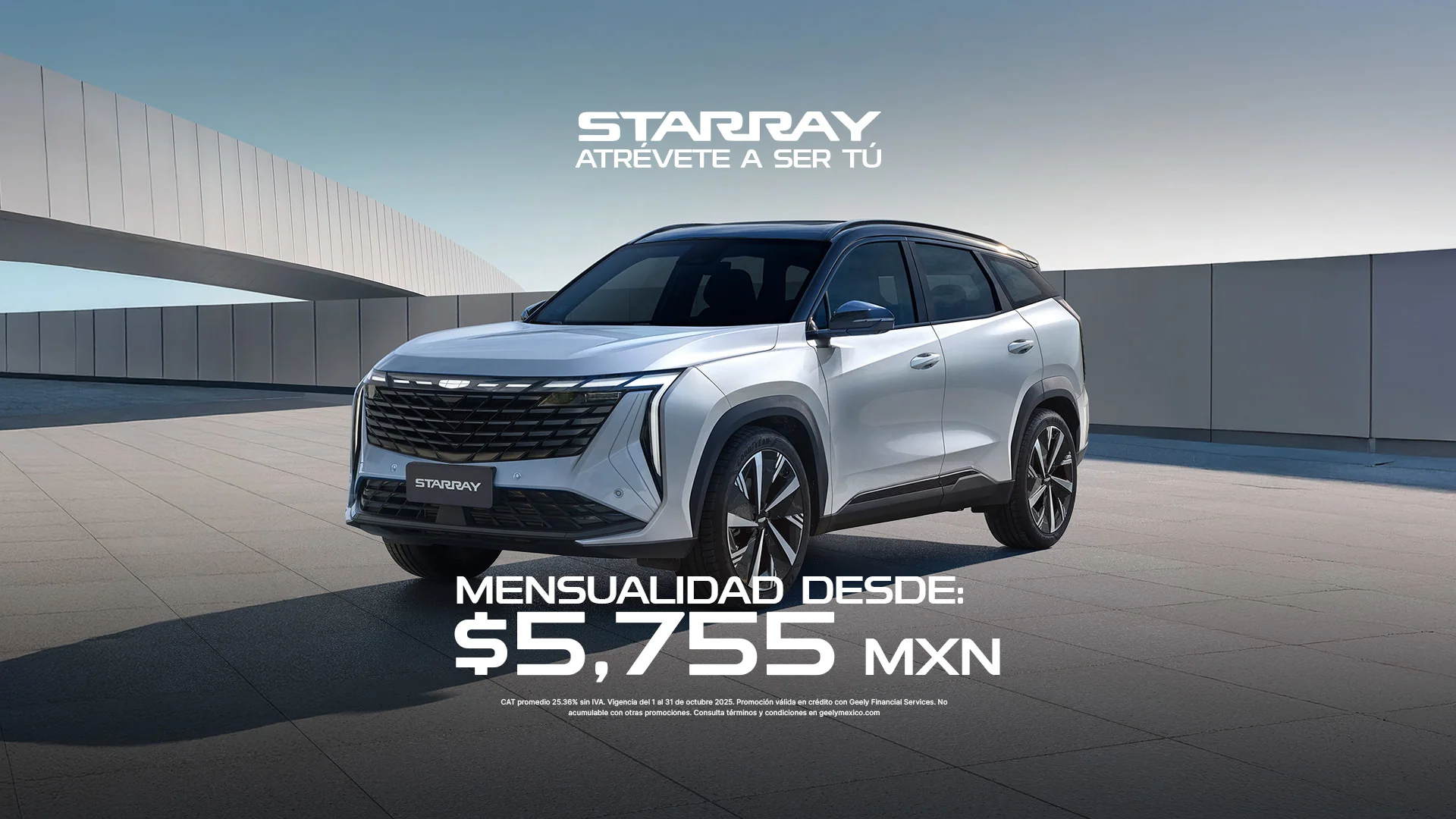 La mensualidad desde $5,755.00 MXN aplica únicamente con el plan de crédito simple, a través de Geely Financial Services (BBVA México S.A., Institución de Banca Múltiple), para el modelo Starray 2025 en su versiones GT 2.0T, con un enganche desde 50%, sobre un importe promedio a financiar de $327,995.00 MXN a un plazo promedio de 72 meses y tasa de interés ordinaria fija anual sin IVA del 6.17% utilizando el bono de $50,000 a subsidio de tasa. Esta oferta no incluye el costo del seguro, mismo que podrá ser cubierto de contado o financiado, conforme a lo estipulado en su contrato, y no es acumulable con otras promociones. Monto de la mensualidad publicada incluye IVA e impuestos. Aplica 2.5% de comisión por apertura. No aplica seguro por un año gratis, y no es acumulable con otras promociones.